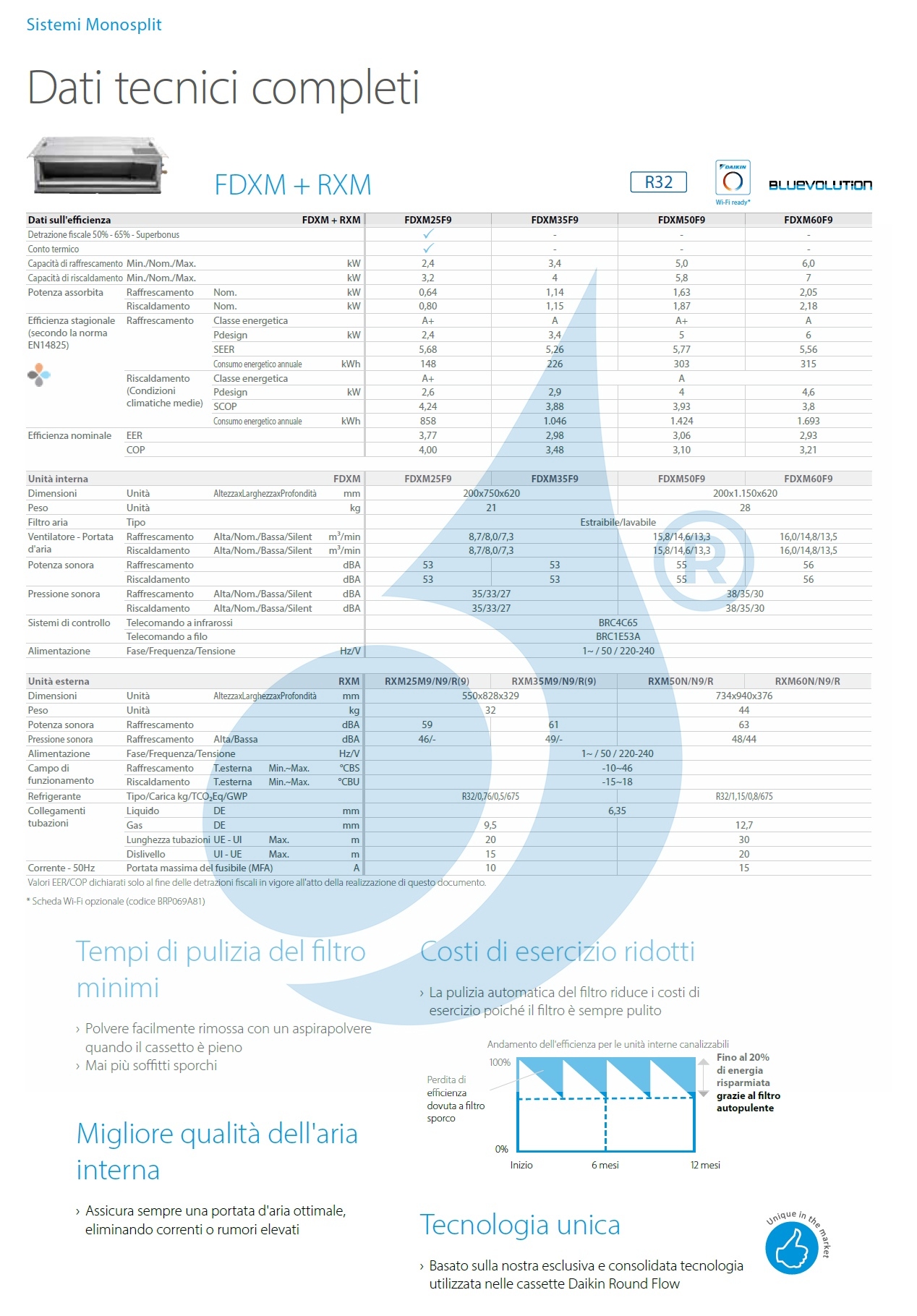 Condizionatore Daikin Mono Split serie FDXM-F9 WiFi Opzionale 12000 Btu riscaldamento con pompa di calore a basso assorbimento di corrente in classe energetica elevata Unità canalizzabile da controsoffitto compatta con un'altezza di soli 200 mm