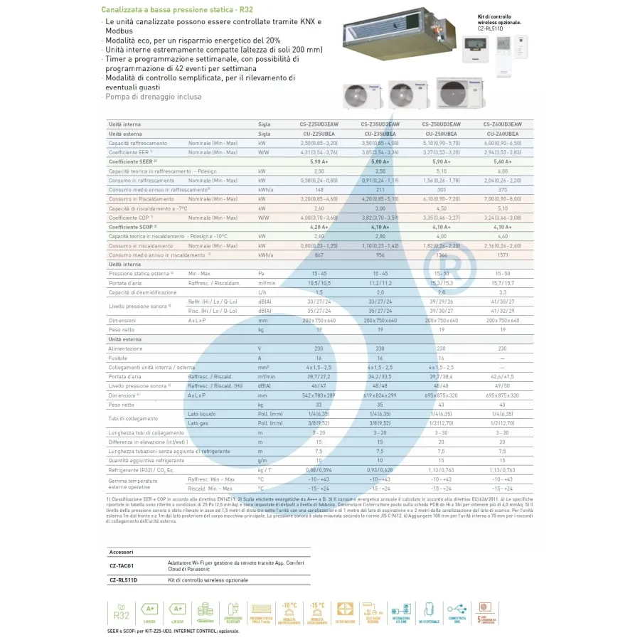 Panasonic Mono Split Canalizzabile 12000 Btu 3.5 kW CS-Z35UD3EAW CU-Z35UBEA Condizionatore Bassa Prevalenza WiFi Opzionale