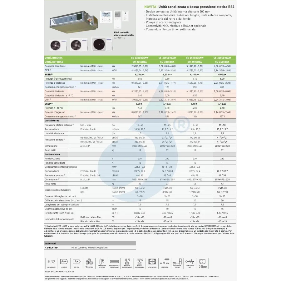 Climatizzatore Panasonic Mono Split Bassa Prevalenza WiFi Opzionale 18000 Btu Pompa di calore, WIFI, compatibile con comando vocale Pompa di scarico inclusa, Filo comando incluso