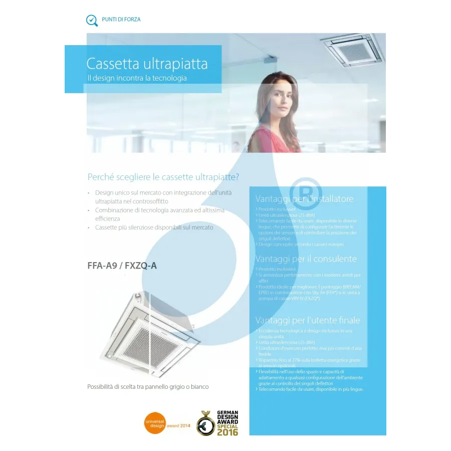 Condizionatore Daikin Penta Split serie 4 vie FFA-A WiFi Opzionale 9+9+9+9+9 Btu riscaldamento con pompa di calore a basso assorbimento di corrente in classe energetica elevata Design unico sul mercato con integrazione dell'unità ultrapiatta nel controsoffitto