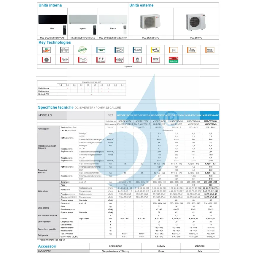 In modo particolare la linea MSZ-EF ottiene valori di SEER e SCOP (indici di efficienza stagionale) che le permettono di raggiungere la Classe A+++ in raffrescamento1 e la Classe A++ in riscaldamento.