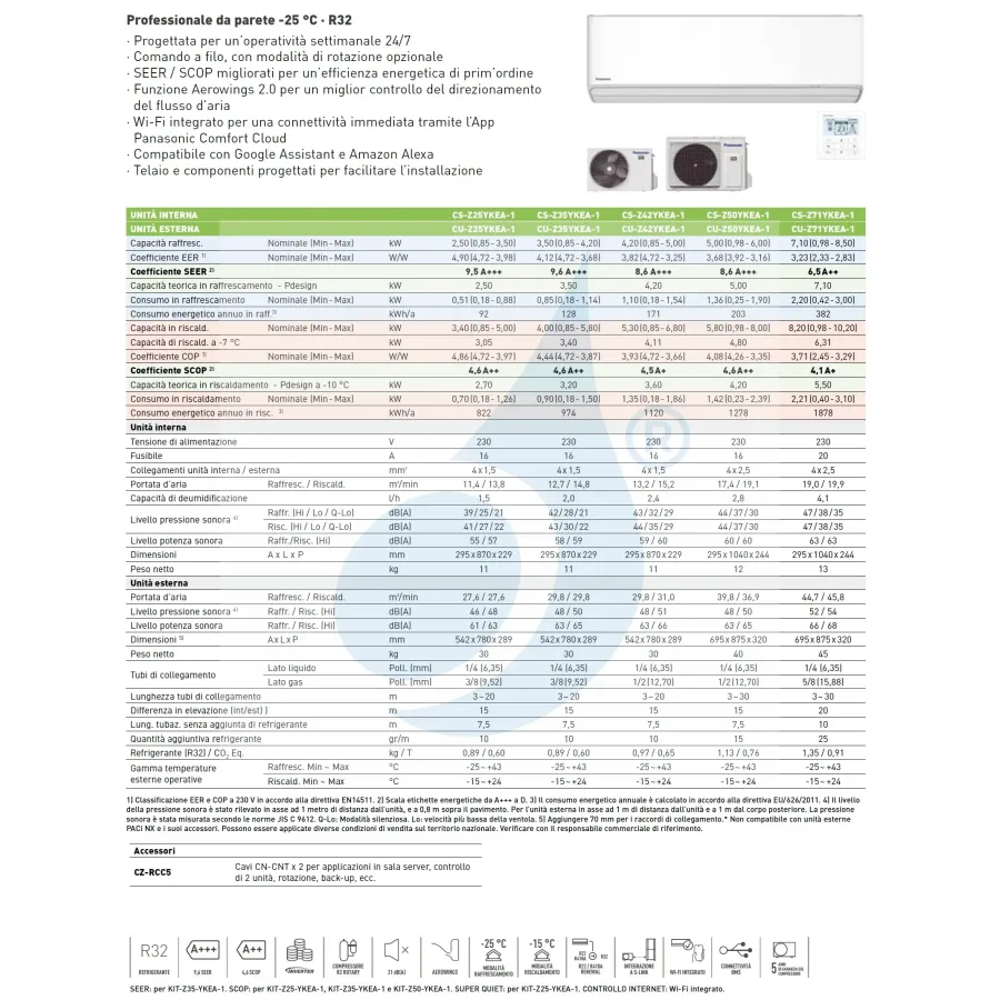 Panasonic Mono Split 9000 Btu CS-Z25YKEA-1 CU-Z25YKEA-1 Condizionatore Serie CS-Z-YKEA Bianco WiFi A+++ A++ Inverter R-32