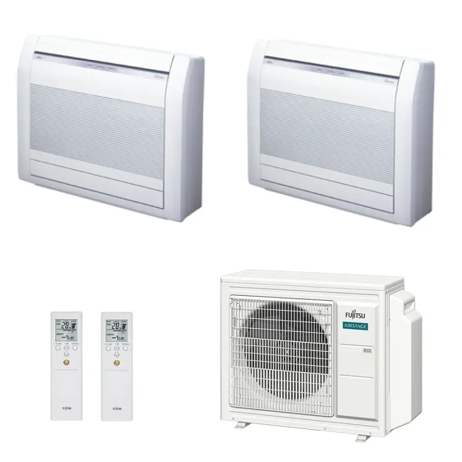 Climatizzatore Fujitsu Dual Split Serie Pavimento KV WiFi Opzionale 15000+15000 Btu riscaldamento con pompa di calore con tecnologia inverter a basso consumo energetico ideale per mansarde, o installazioni sotto finestra, ottimale per il riscaldamento grazie alla sua posizione vicino al pavimento