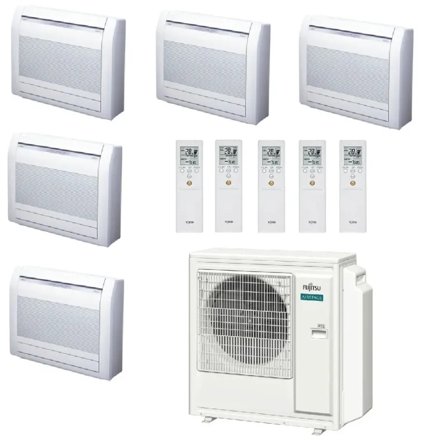Climatizzatore Fujitsu Penta Split Serie Pavimento KV WiFi Opzionale 9+9+9+9+15 Btu riscaldamento con pompa di calore con tecnologia inverter a basso consumo energetico ideale per mansarde, o installazioni sotto finestra, ottimale per il riscaldamento grazie alla sua posizione vicino al pavimento