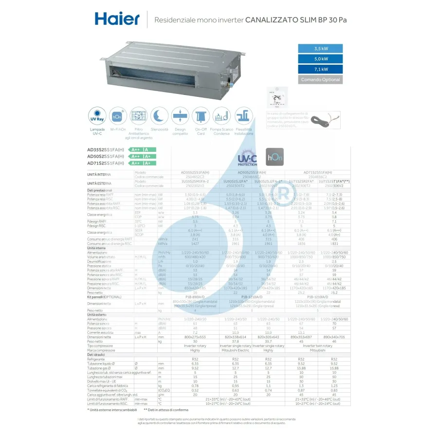 Haier Mono Split 18000 Btu Canalizzato Slim Bassa Prevalenza 5.0 kW AD50S2SS1FA(H) 1U50S2SJ2FA-2 Condizionatore WiFi R-32