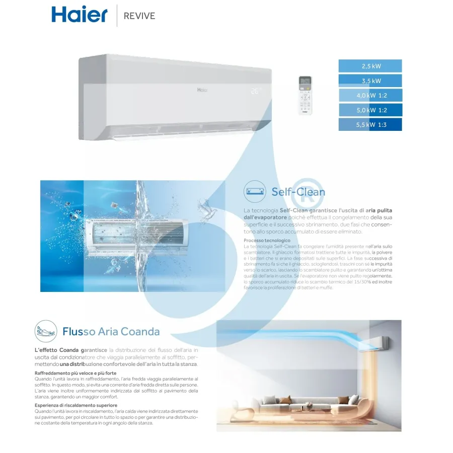 Climatizzatore Haier Mono Split Serie Revive WiFi 12000 Btu riscaldamento con pompa di calore ad alta efficienza con bassi consumi energetici, deumidificatore, Telecomando di serie