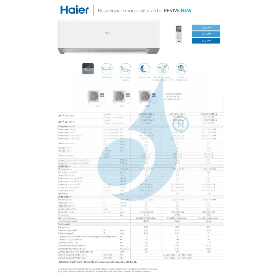 Haier Mono Split 18000 Btu Revive Bianco 5.0 kW AS50RCBHRA-3 1U50MERFRA-3 Condizionatore WiFi Inverter R-32